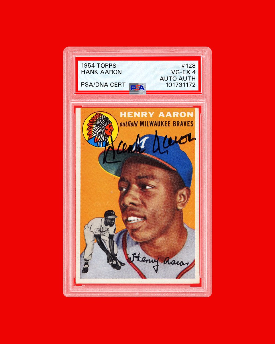 755 home runs left a mark on the record books, and the late Hank Aaron left his mark on this 1954 Topps rookie card, via an on-card auto to pair with the Henry Aaron facsimile within the iconic design. pic.twitter.com/ulJZ6diXVW