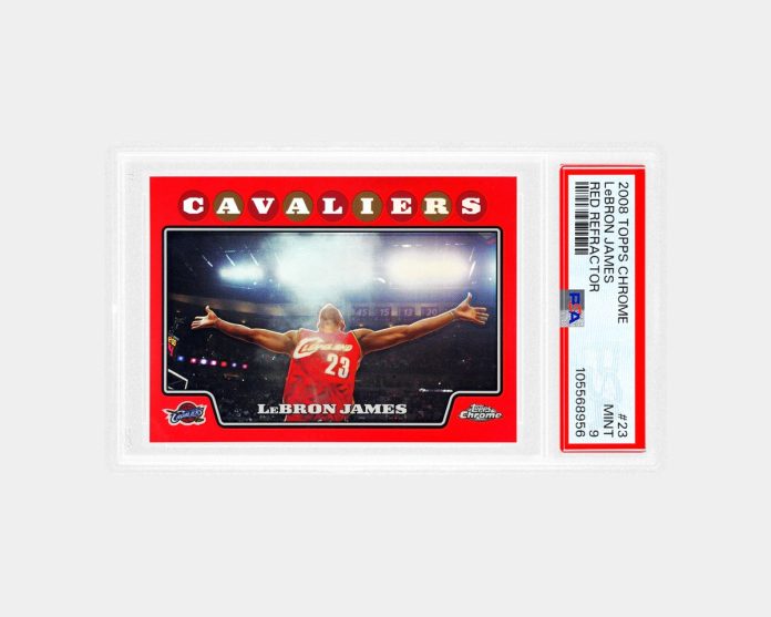 𝙅𝙐𝙎𝙏 𝙂𝙍𝘼𝘿𝙀𝘿 👑 Every basketball fan knows that chalk in the air means it’s go time for King James. No card has ever captured that moment better than Topps did in 2008. This Topps Chrome Red /5 is now Pop 1 as a PSA 9, with only one copy graded higher.