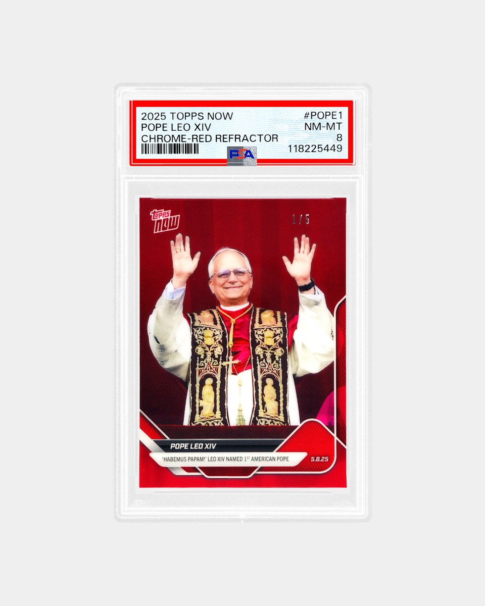 Per Topps NOW, a total print run of 133,535 cards puts this just-graded Chrome parallel on a pedestal at 1:26,707 odds. Given the Pope’s traditional garb, the Red Refractor also makes for a rare mozzetta color-match.