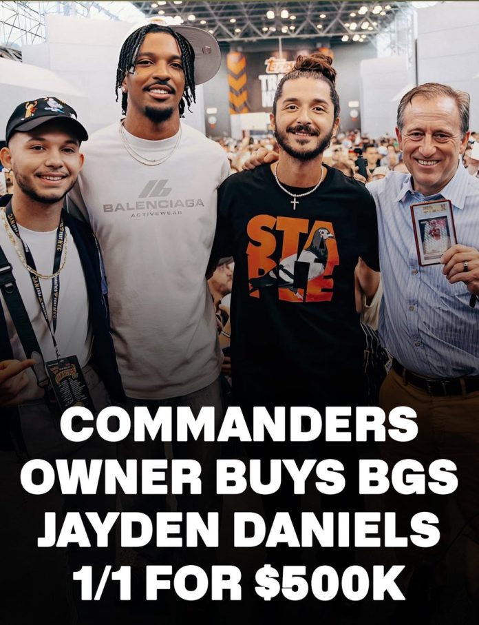 Josh Harris purchased this Jayden Daniels RC 1/1 Prizm Black Finite BGS 9.5 live on stage at @FanaticsFest. Joined by Daniels and Michael Rubin, the Commanders owner walked away with one of the most talked-about cards of the weekend. 📸: @Fanatics