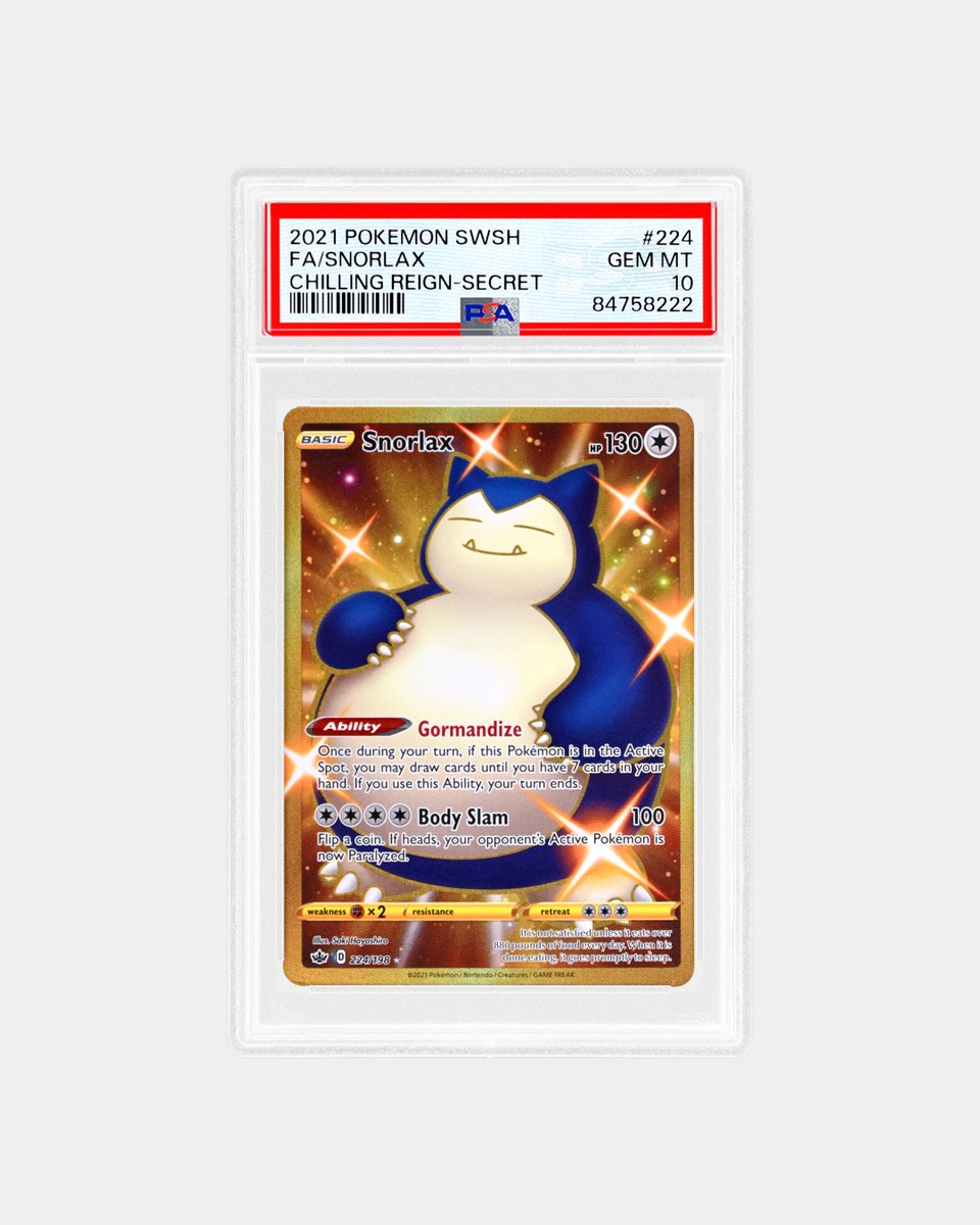 The set is Chilling Reign—but the vibe is chilling hard. Like other gold Secret Rares from the Sword & Shield era, this card presents the Shiny version of Snorlax. While the color looks slightly different, that lazy Sunday smile is spot on.