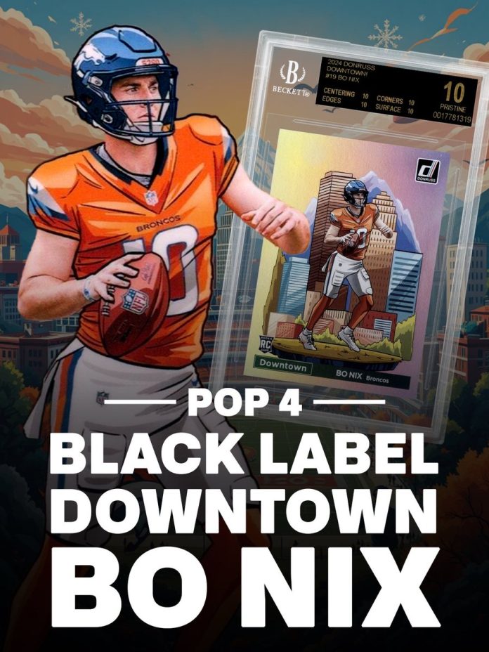 Released in 2024, the Donruss Downtown! Bo Nix rookie is a case-hit SSP. Downtowns are among the hobby’s most recognizable inserts, and this copy carries even more weight as a pop 4 #BGSBlackLabel