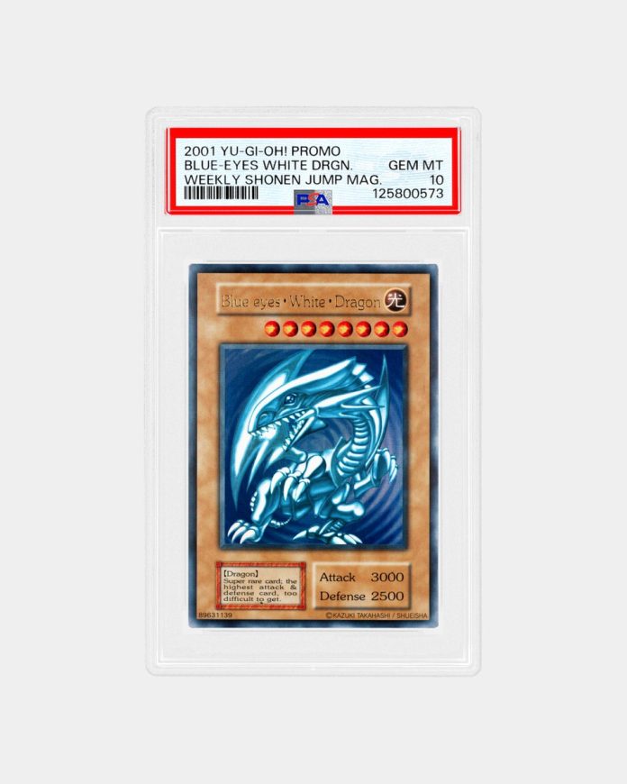 This Yu-Gi-Oh! lottery grail was advertised in the Weekly Shลnen Jump, one of the longest-running manga magazines in circulation since 1968. Just 1,000 Asian English Blue-Eyes White Dragon promo cards were awarded, and due to their delicate nature, achieving a PSA 10 grade is exceptionally challenging.