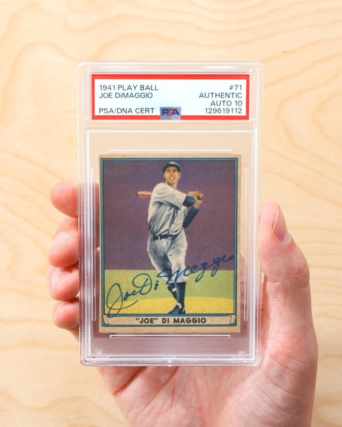 Joe DiMaggio’s most iconic card, dated to the year of his unbreakable 56-game hitting streak, signed by the 𝙔𝙖𝙣𝙠𝙚𝙚 𝘾𝙡𝙞𝙥𝙥𝙚𝙧 himself.