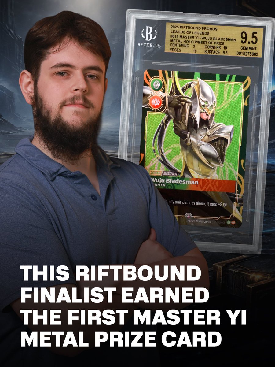 Among the standout rewards were Best-Of metal prize cards, awarded to the top-performing players piloting specific champion decks. Daniel Zidenberg (Challenger TCG) placed 2nd overall and earned the metal holo #019 Master Yi – Wuju Bladesman after posting the strongest results with the Master Yi deck.— Beckett Collectibles (@beckettcollect) Dec 23, 2025