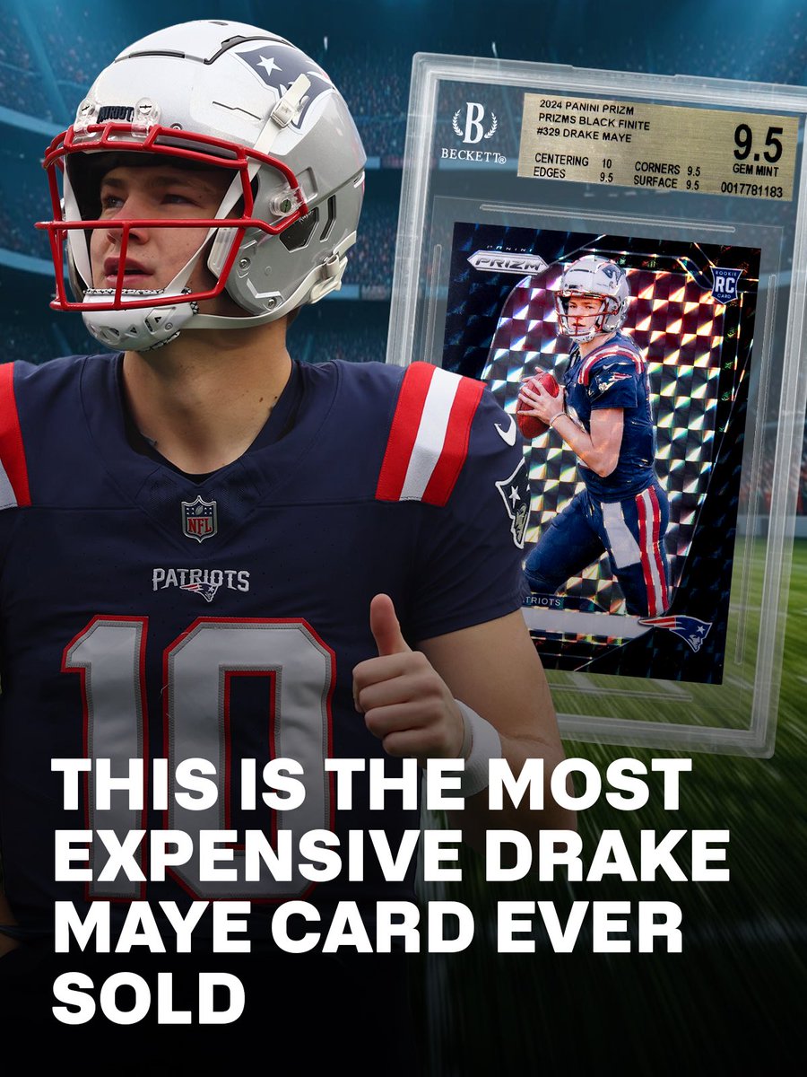 This 2024 Panini Prizm Black Finite Drake Maye 1/1 rookie earned a BGS Gem Mint 9.5 (True Gem+) and later sold for $109,800, marking the most expensive Maye card to date.
