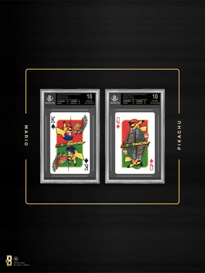 Released in 2016, the Mario Pikachu playing card deck was sold exclusively at Pokémon Center Japan as part of the Mario × Pokémon crossover. Featured here are the King and Queen from the set, both graded #BGSBlackLabel 🔥
