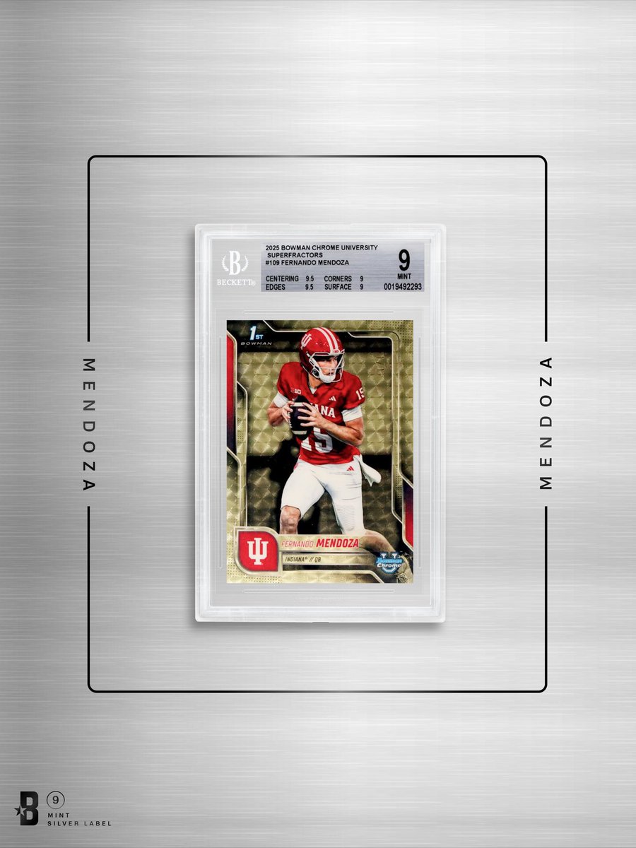This 2025 Fernando Mendoza Bowman Chrome University Superfractor just sold for $78,000, setting a new all-time high for any Mendoza card.