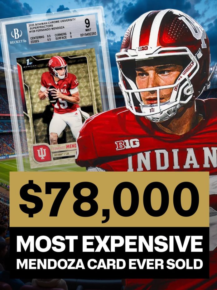 This 2025 Fernando Mendoza Bowman Chrome University Superfractor sold for $78,000, a new record for any Mendoza card.