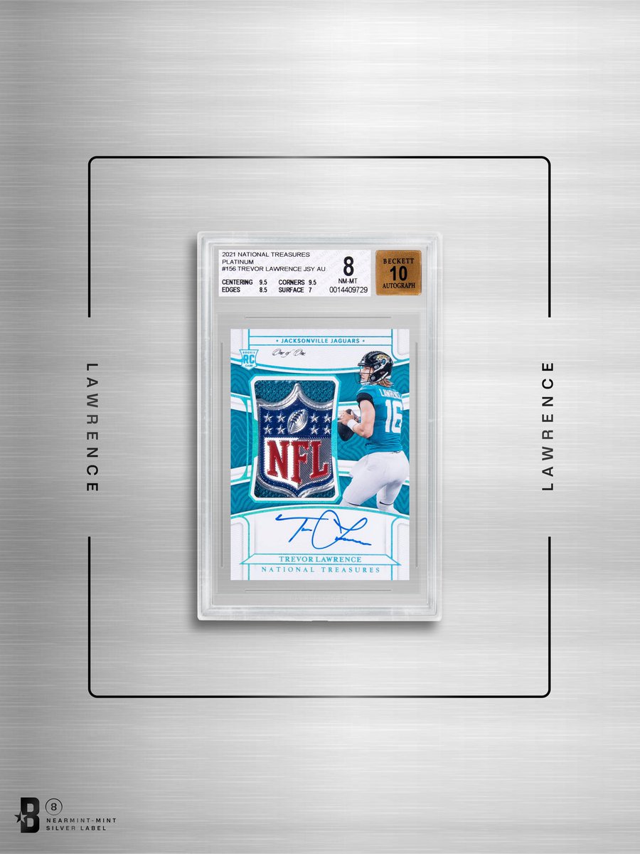 The most expensive Trevor Lawrence card ever sold. 2021 Panini National Treasures NFL Shield RPA (BGS 8) β $336,000.