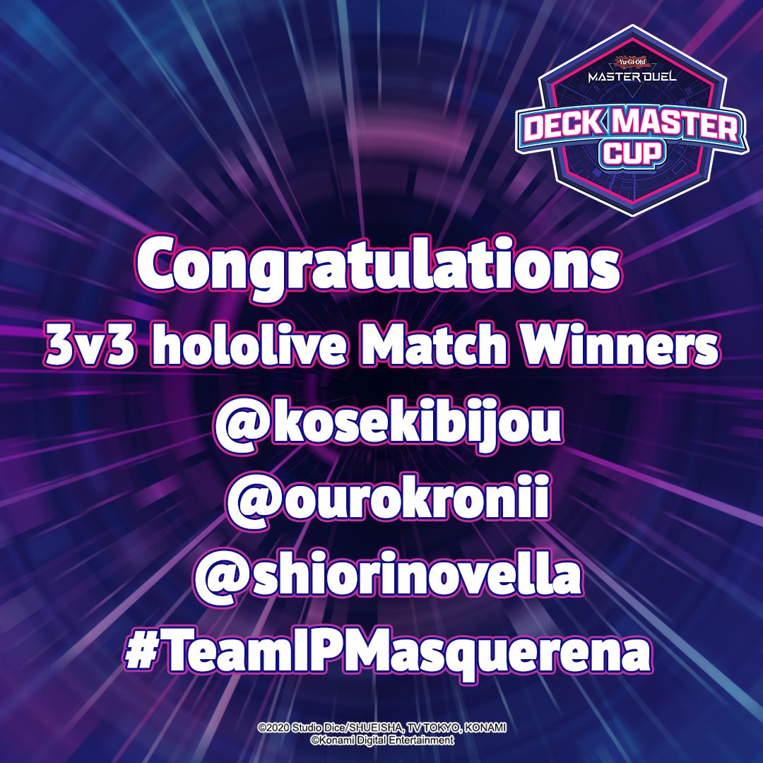 After an intense series of Duels, #TeamIPMasquerena (@kosekibijou, @ourokronii, @shiorinovella) wins the 3v3 hololive Match!