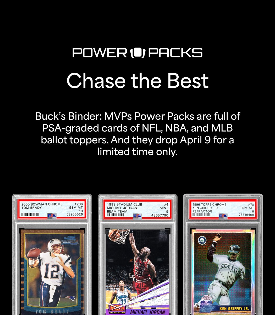 Want to chase sports legends such as Brady, Jordan, LeBron, Ohtani, Griffey Jr., and more? Then get ready for Buck’s Binder: MVPs Power Packs dropping April 9 for a limited time. With every NFL, NBA, and MLB MVP of the last 30 years represented, you’re guaranteed to land… pic.twitter.com/mxzcoLh4br
