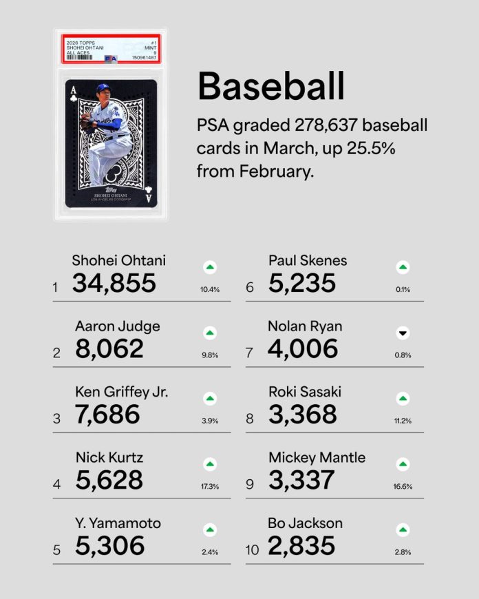 For the month that spans Spring Training, the WBC, and Opening Week, baseball topped all sports with over 278,000 PSA-graded cards. pic.twitter.com/8QpmzlORWP