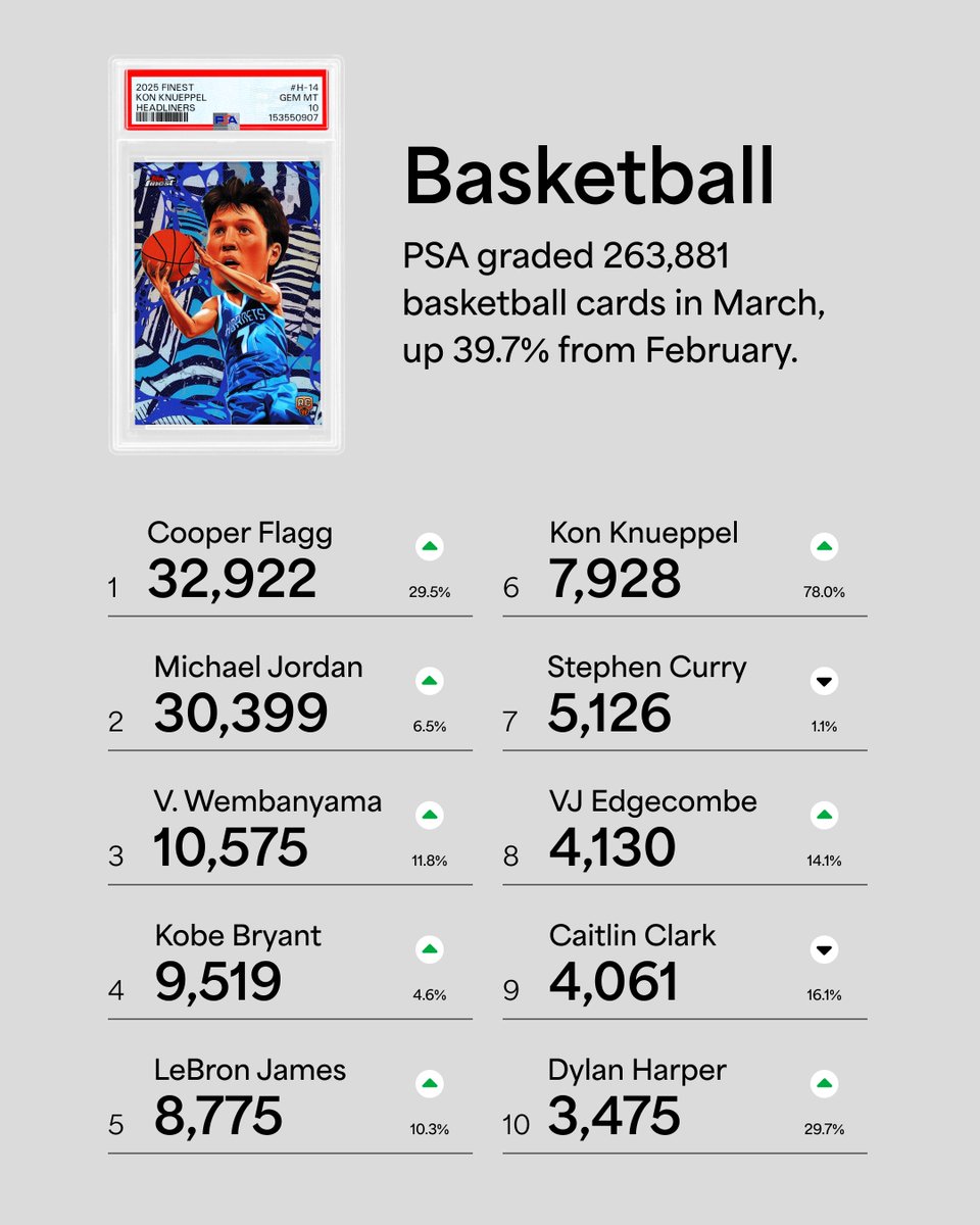 Kon Knueppel’s collectable rise equated to a 78% spike, but the month belonged to Cooper Flagg. All told, PSA graded over 263,000 basketball cards in March. pic.twitter.com/8m6ffkccKJ