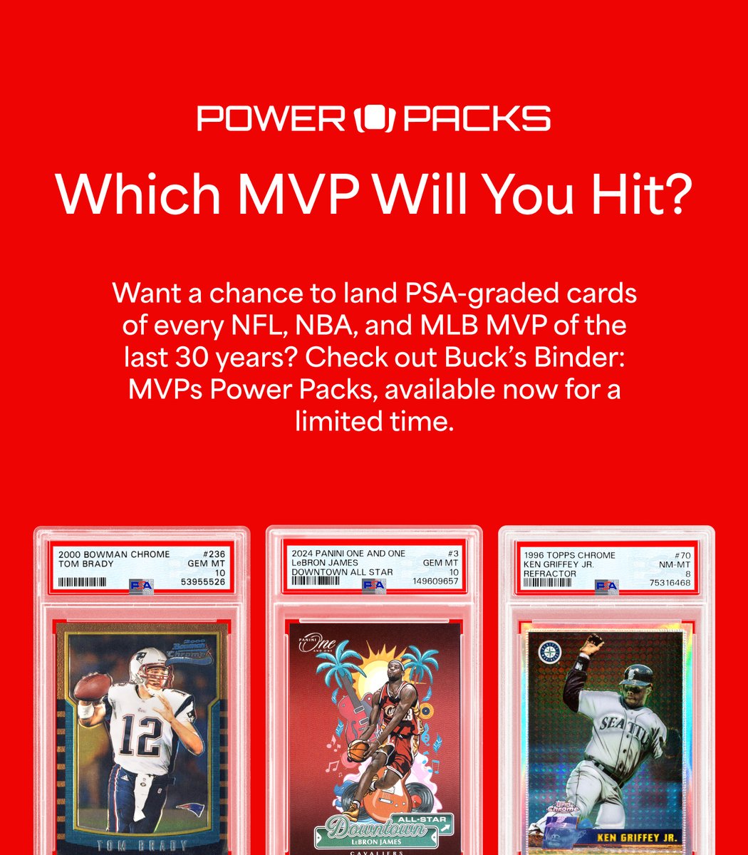 Buck’s Binder: MVPs Power Packs are here. Chase 30 years of NBA, NFL, and MLB trophy winners, including Brady, LeBron, Griffey Jr., Ohtani, Jordan and more while supplies last.