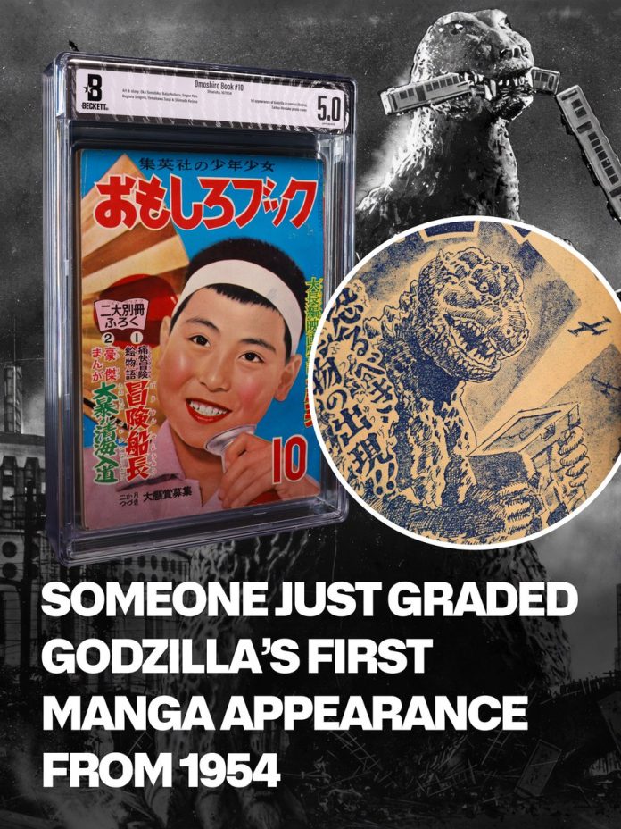 October 1954’s issue of Omoshiro Book includes Godzilla’s 1st appearance in manga, with the famous illustration of Gojira biting a train and interior booklet which pre-dates the original film. The story spans between this issue and the November supplement that had his first cover appearance.