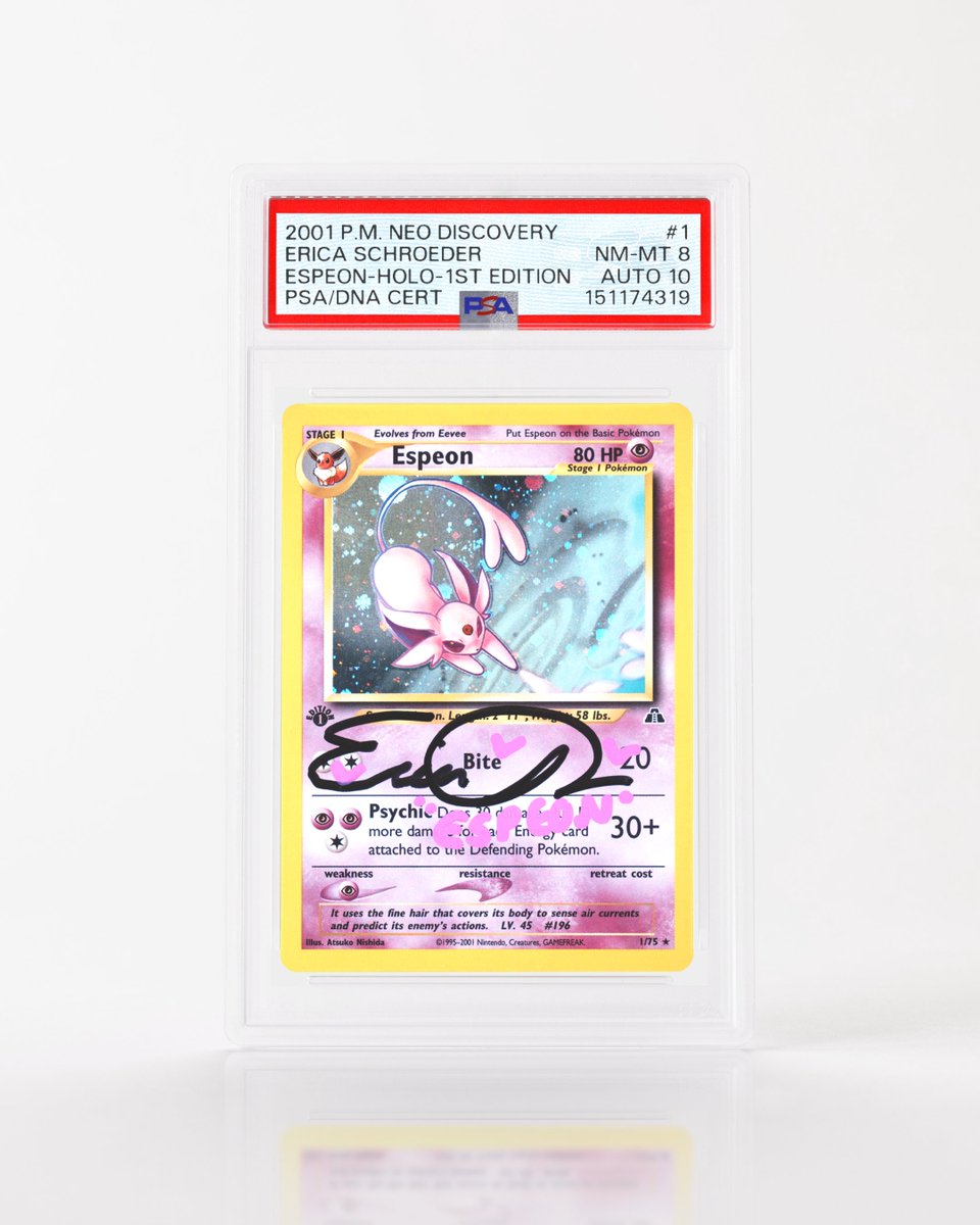 This 1st Edition Holo is signed and inscribed by Erica Schroeder, prolific voice actor of countless Pokémon characters, including Espeon. pic.twitter.com/Afon9nlv1z